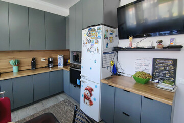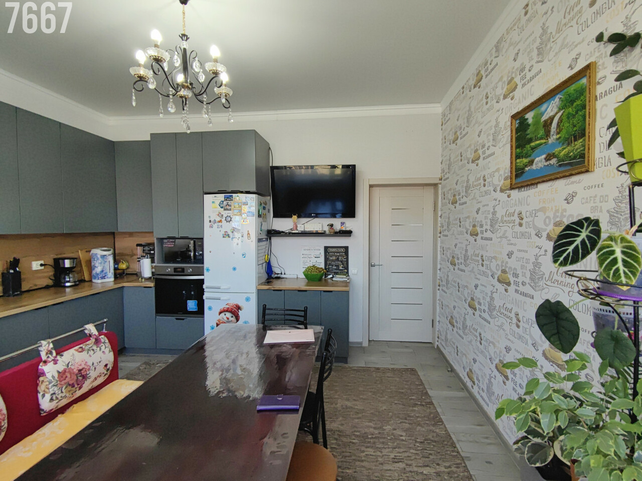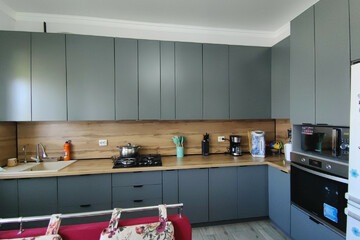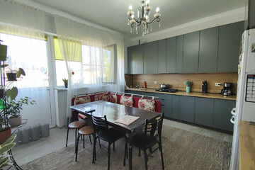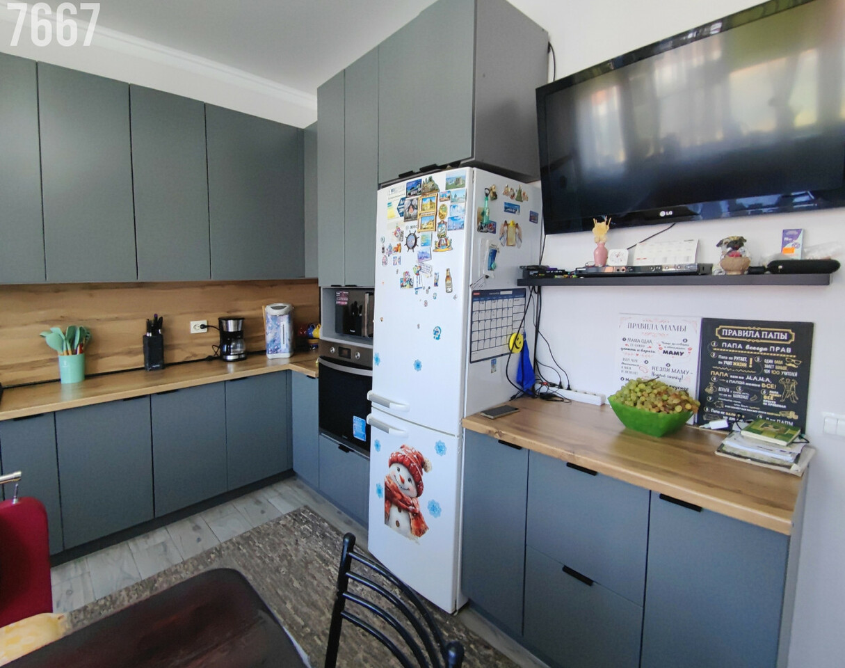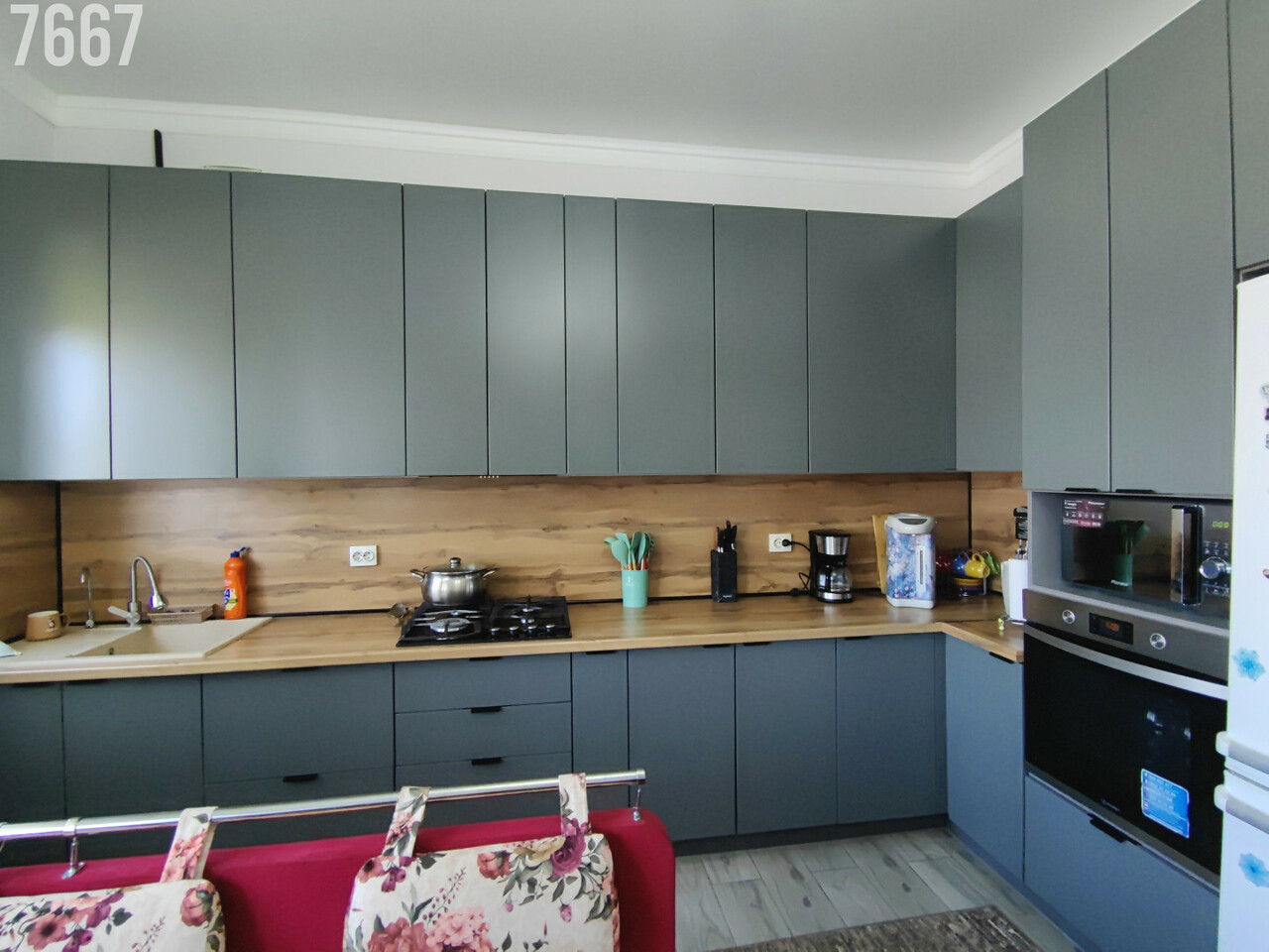 - Бонусом в доме остаётся оборудованный кухонный гарнитур премиум класса со встроенной техникой: варочная панель, духовой шкаф, вытяжка.