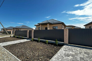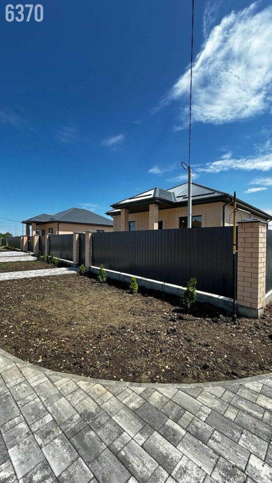 -Участок правильной формы, по периметру установлен забор из металлопрофиля с кирпичными колоннами, ворота откатные.