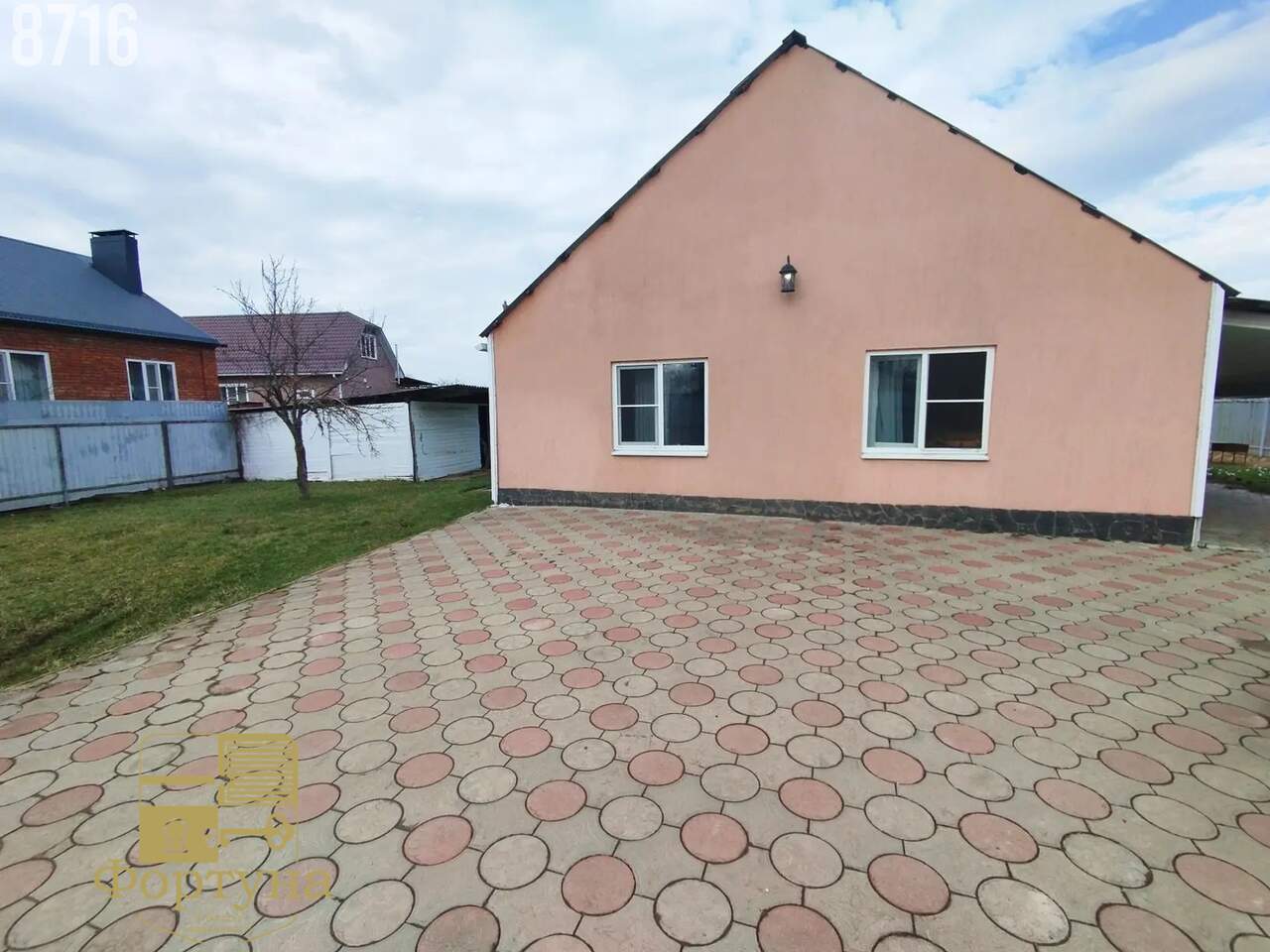 Ландшафт: Продуманный двор с асфальтированными дорожками, зелеными зонами и уютным навесом для отдыха или парковки.
