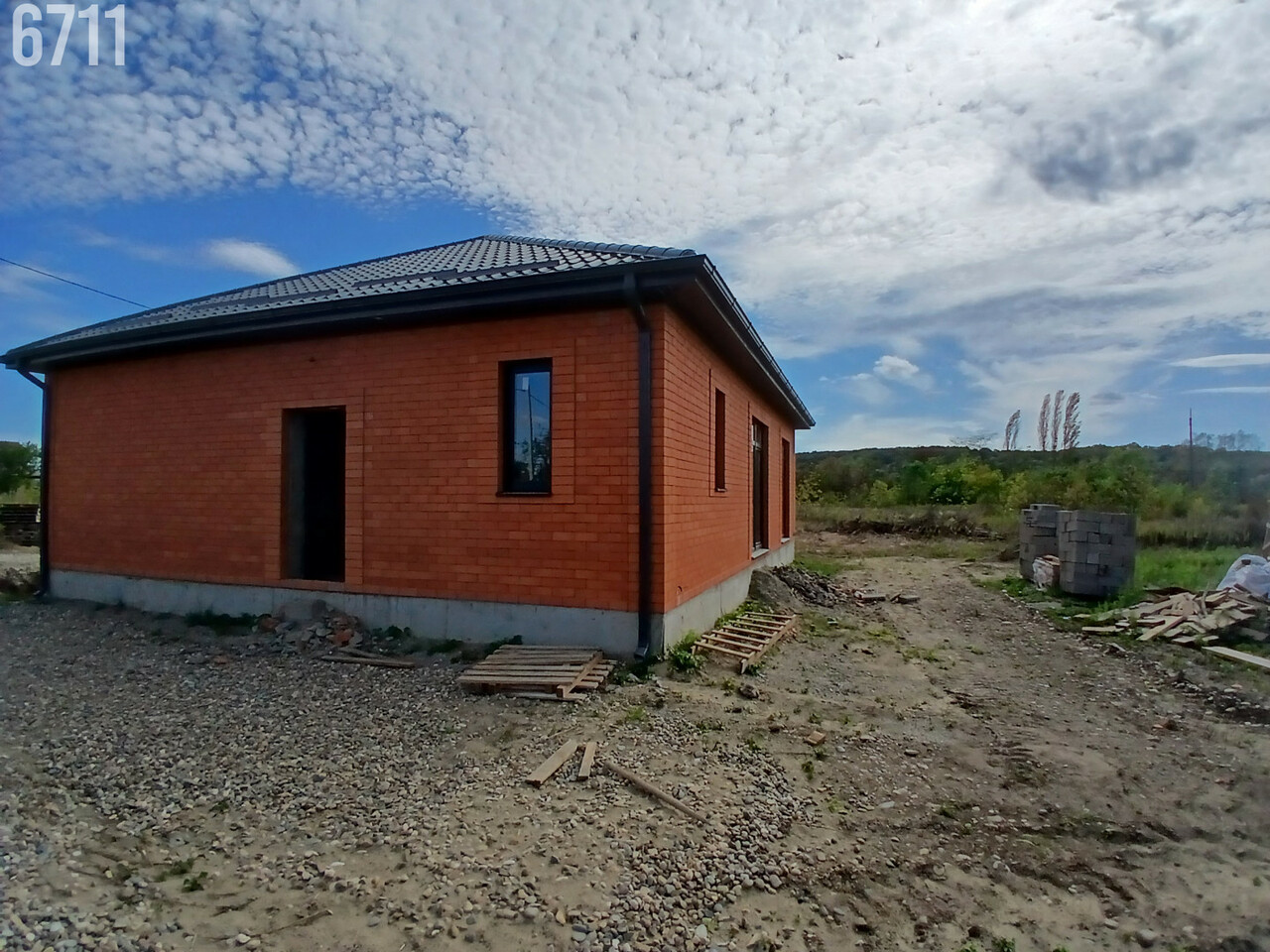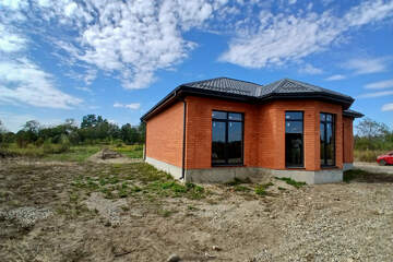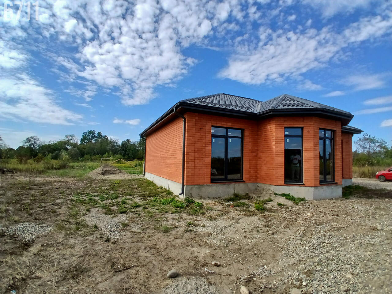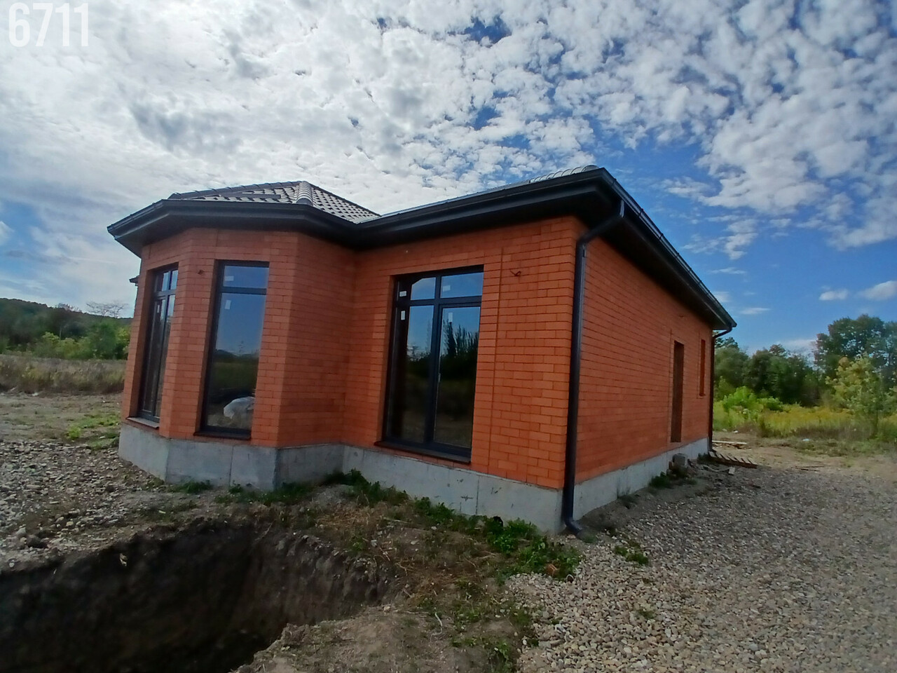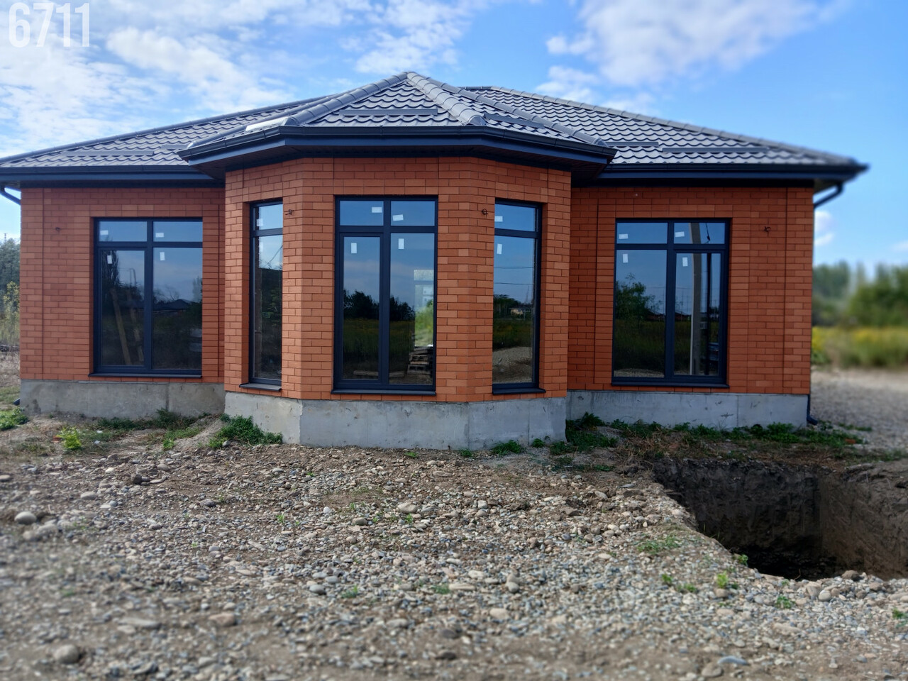 . Дом построен из блока, утеплен и обложен кирпичом. Крыша - метало черепица, Во всем доме витражные окна. Дом будет достроен к середине октября, цена не измениться. Перед входом колонны для навеса. Можем Ваши пожелания воплотить в жизнь.