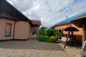 . Двор: ролевые ворота, плитка, навес под машину, беседка для отдыха, диван - качеля.