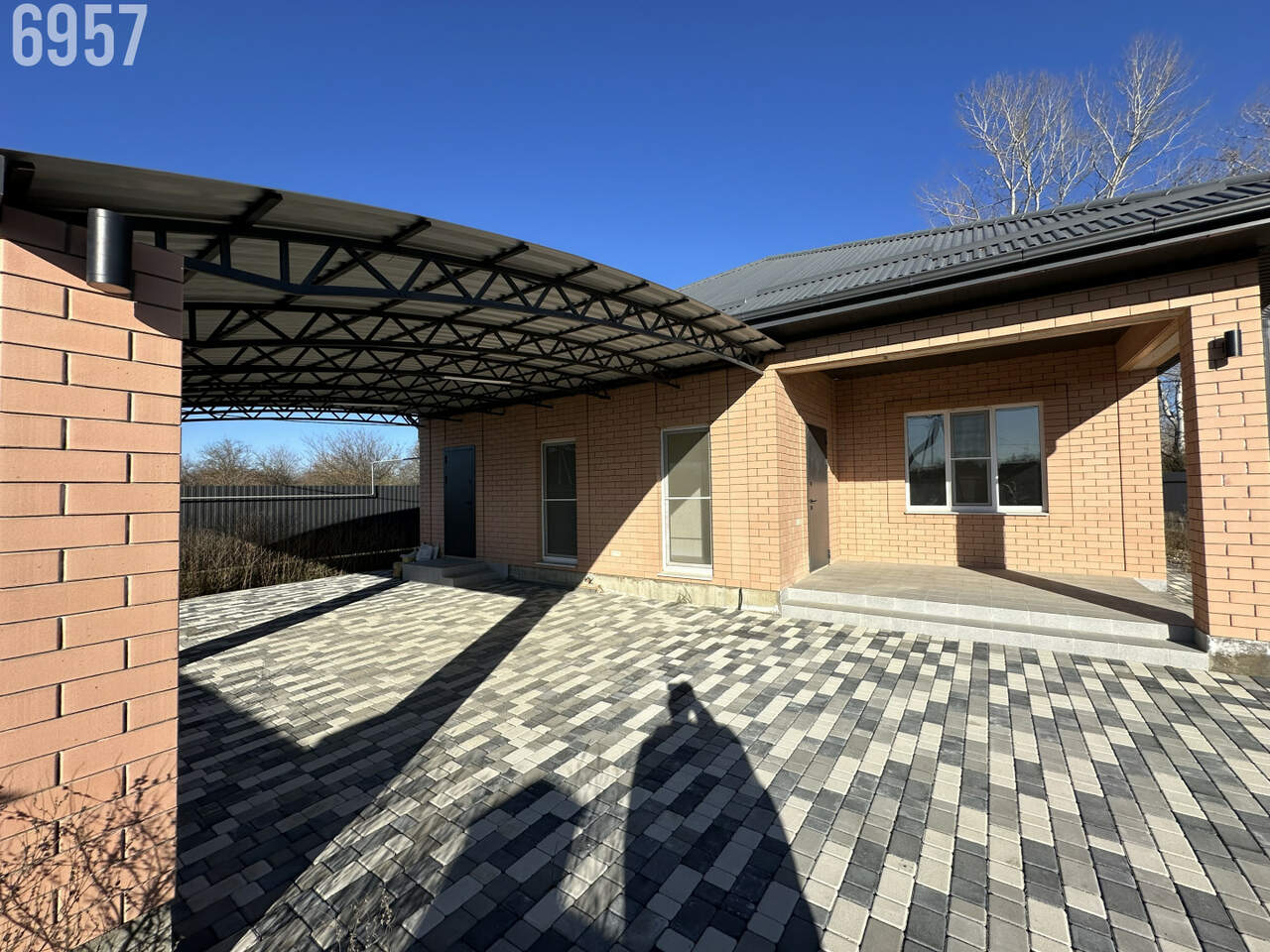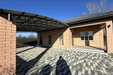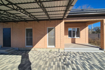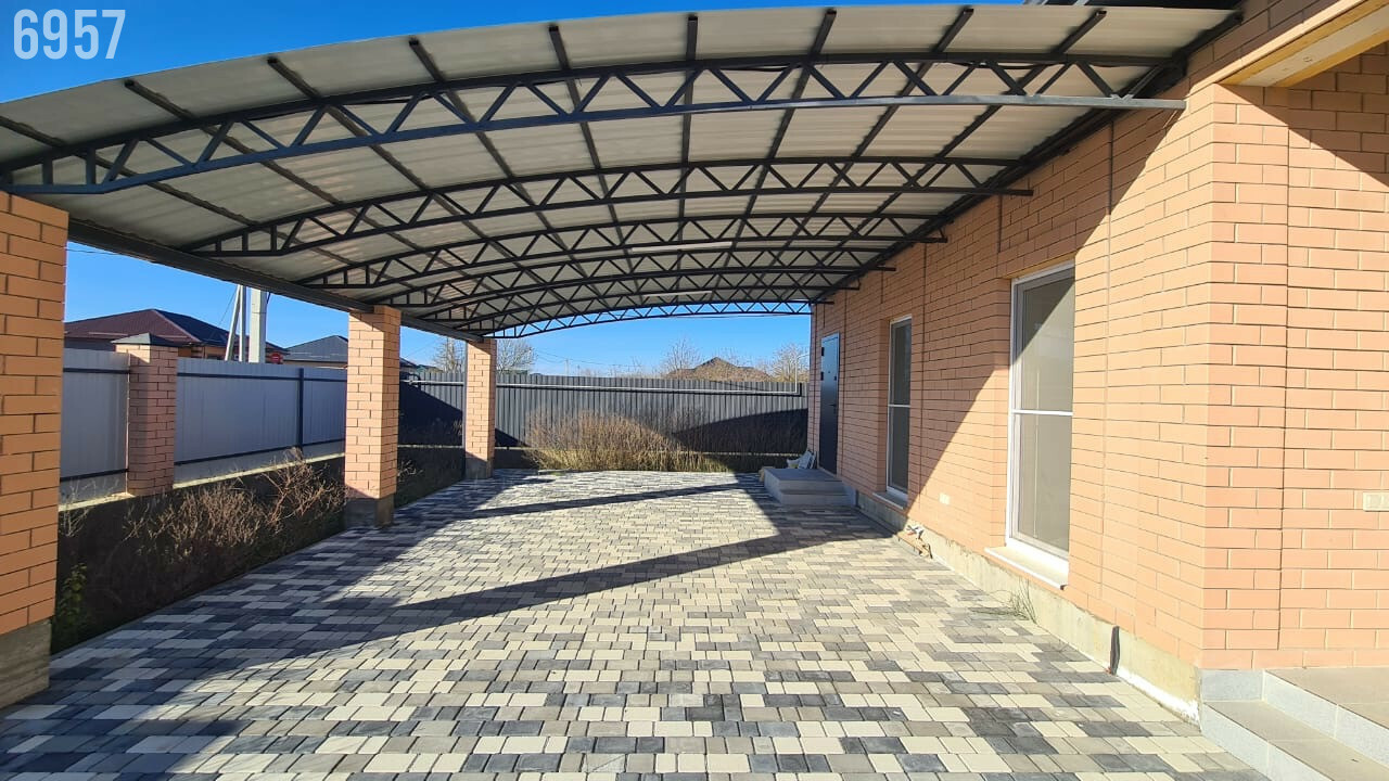 - Двор вымощен плиткой и огорожен по периметру капитальным забором, имеется заезд для машины, капитальный навес, освещение по периметру участка.