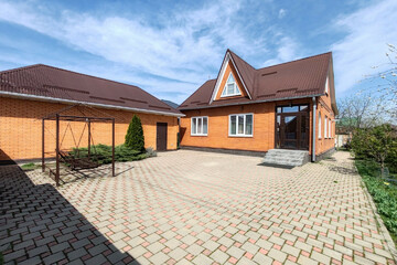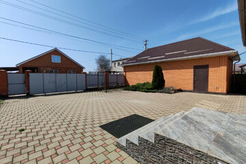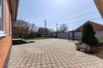 - Двор, вымощенный плиткой — аккуратно и практично в любое время года.