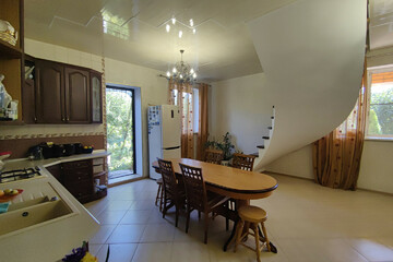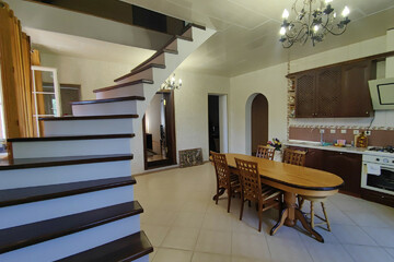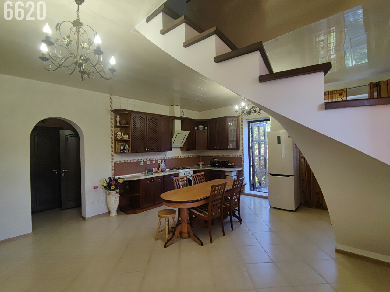 - В доме два входа, на первом этаже кухня-столовая, гостиная, спальня, с/у. На втором этаже две спальни и гостиная-хол