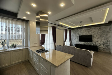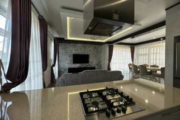 Современная планировка: большая кухня-гостиная, три спальные комнаты, два санузла, холл, котельная.