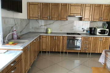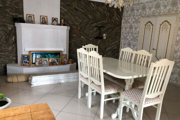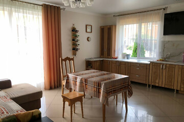 1-й уровень - гараж, прихожая 24 кв.м, кухня-гостиная 26 кв.м., каминная 26 кв.м. с выходом на террасу, совмещенный санузел.