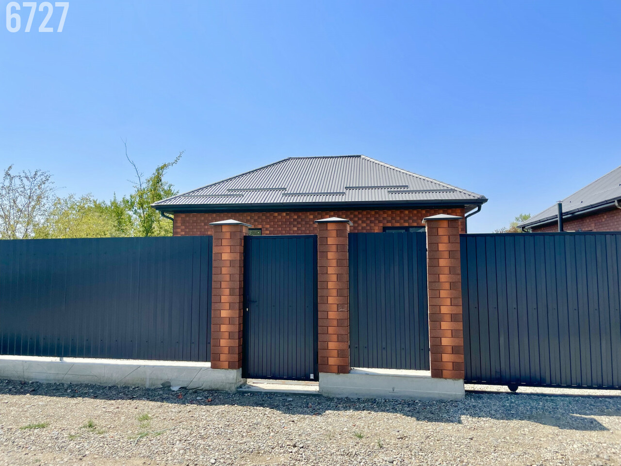 - По периметру имеется забор из проф настила на ленточном фундаменте, по фасаду с кирпичными колоннами.