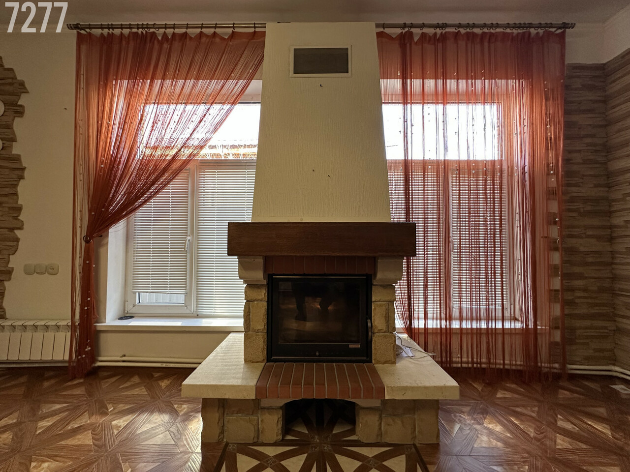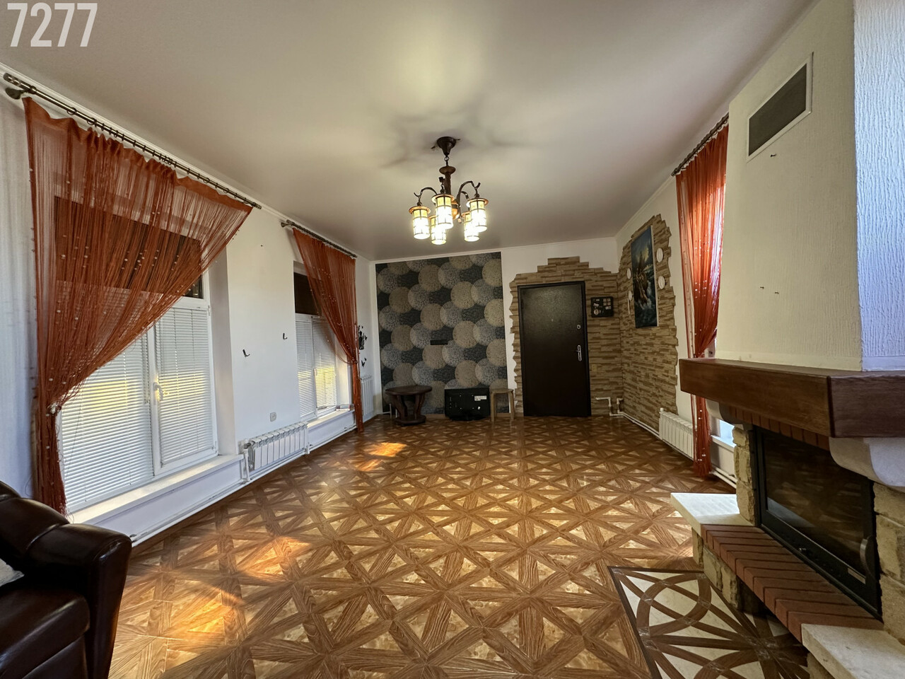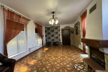 Планировка: спальня, кухня, гардеробная, гостиная с камином, совмещенный санузел (туалет + душ)