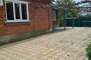 Двор вымощен брусчаткой, имеется гараж, летняя кухня, курятник, душ, хоз. постройки. Ухоженный участок правильной формы, посажены разнообразные плодово-ягодные деревья и кустарники.