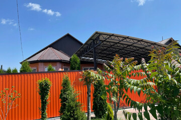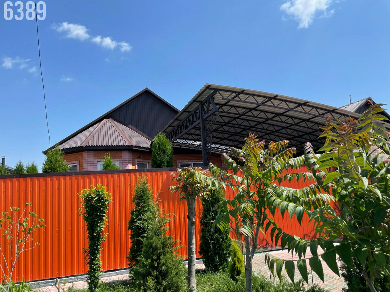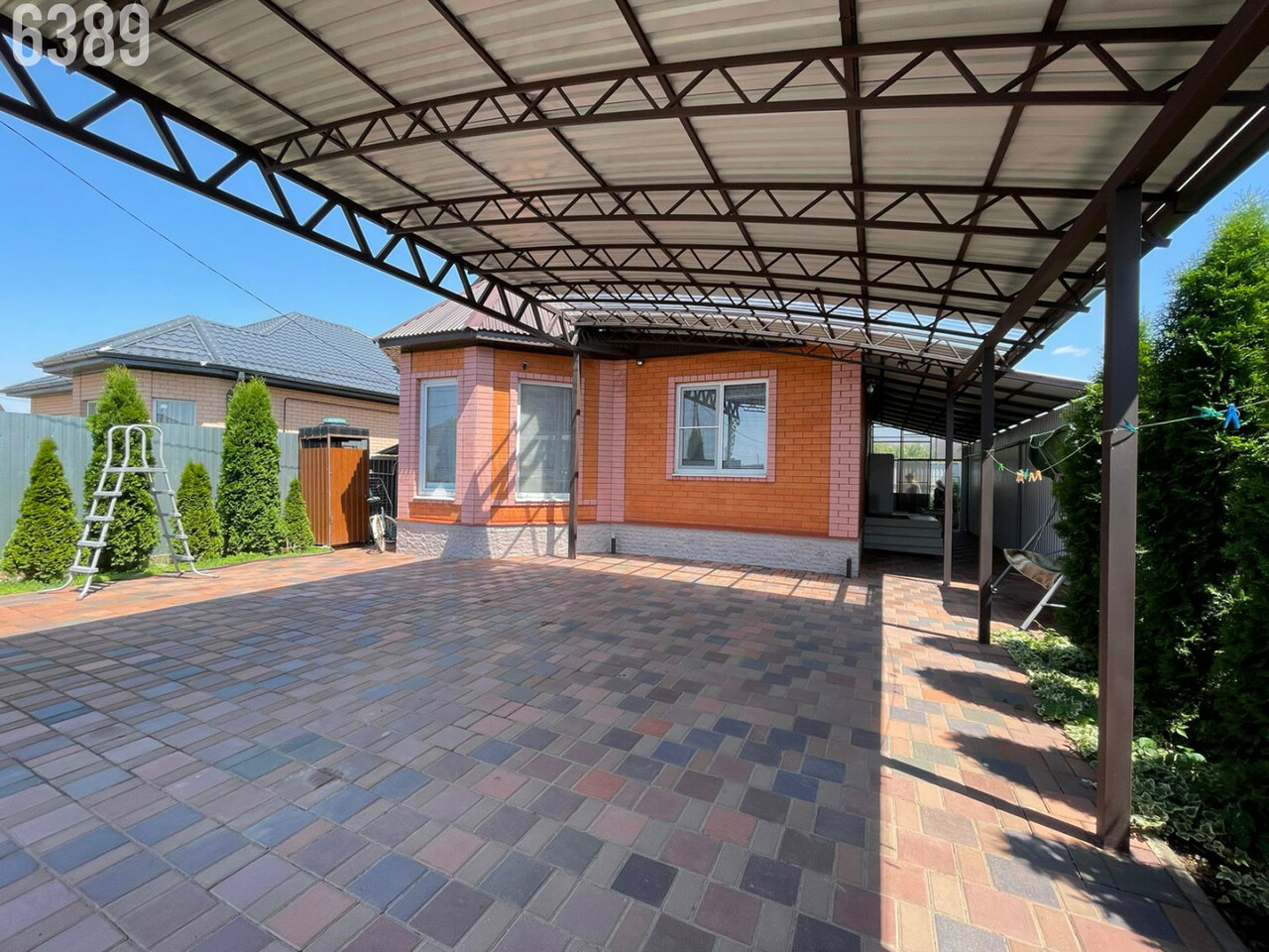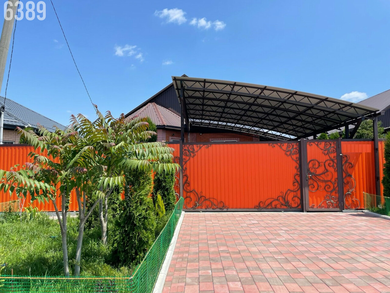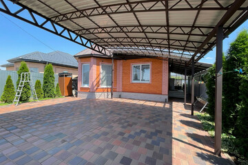 - двор вымощен плиткой, имеется крытый навес для машины, по периметру забор, откатные ворота, калитка;