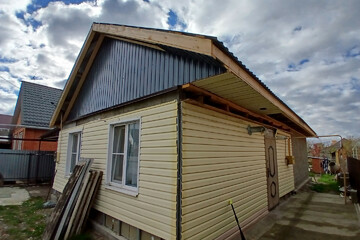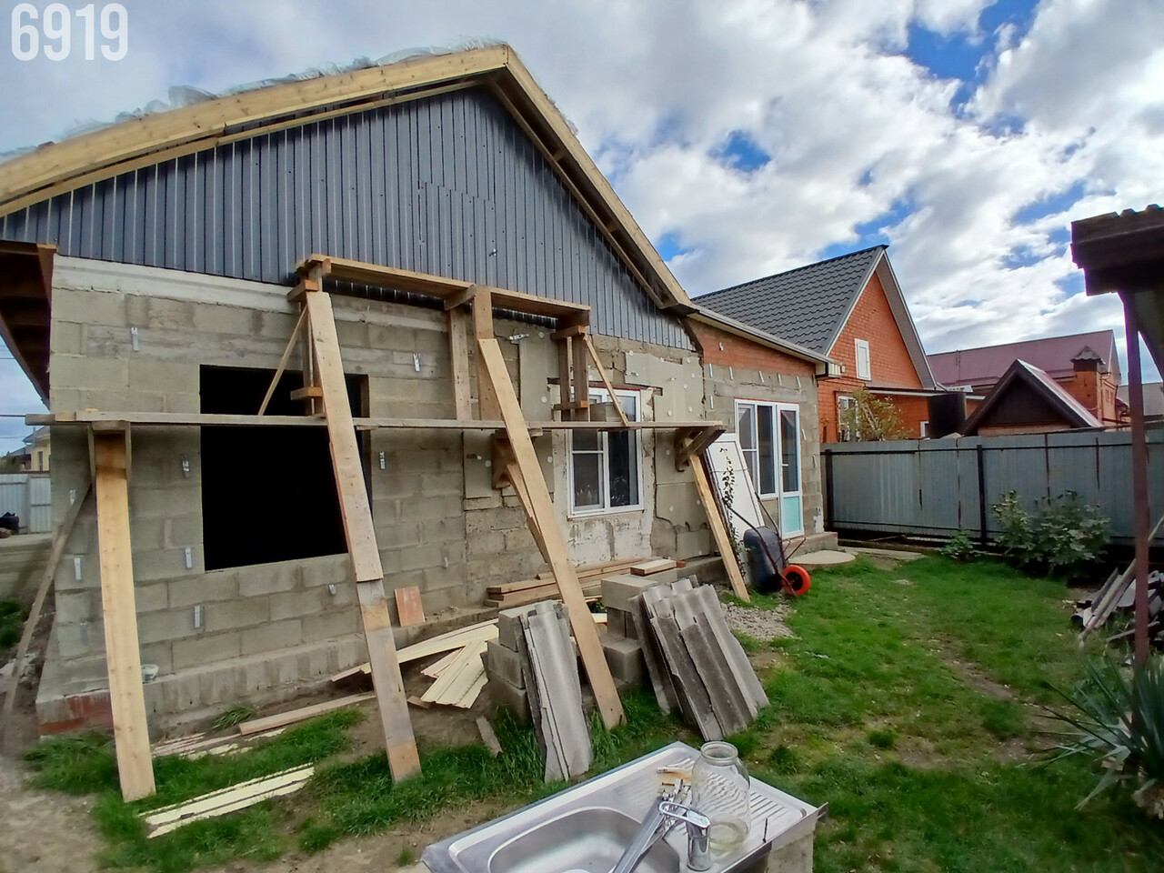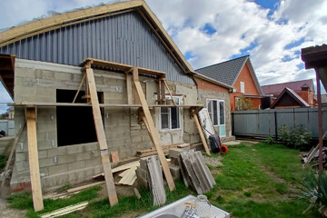 Дом построен из тёплого и прочного материала блок - в данный момент на стадии реконструкции (замена обшивки дома). Фундамент (ленточный) на бетонной армированной плите, плиты перекрытия, крыша метало черепицы. Скважина 12 метров.